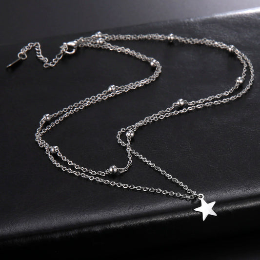 KKjoy Star Pendant Necklace for Women Silver Color Stainless Steel Beads Double Chain Collars Minimalist Jewelry Accessories New