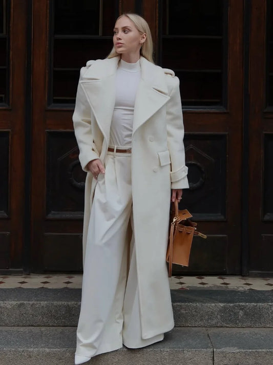 Elegant Solid Lace Up Overcoat Women Fashion Double-breasted Wool Pockets Long Coats 2025 Autumn Winter High Street Outerwears