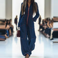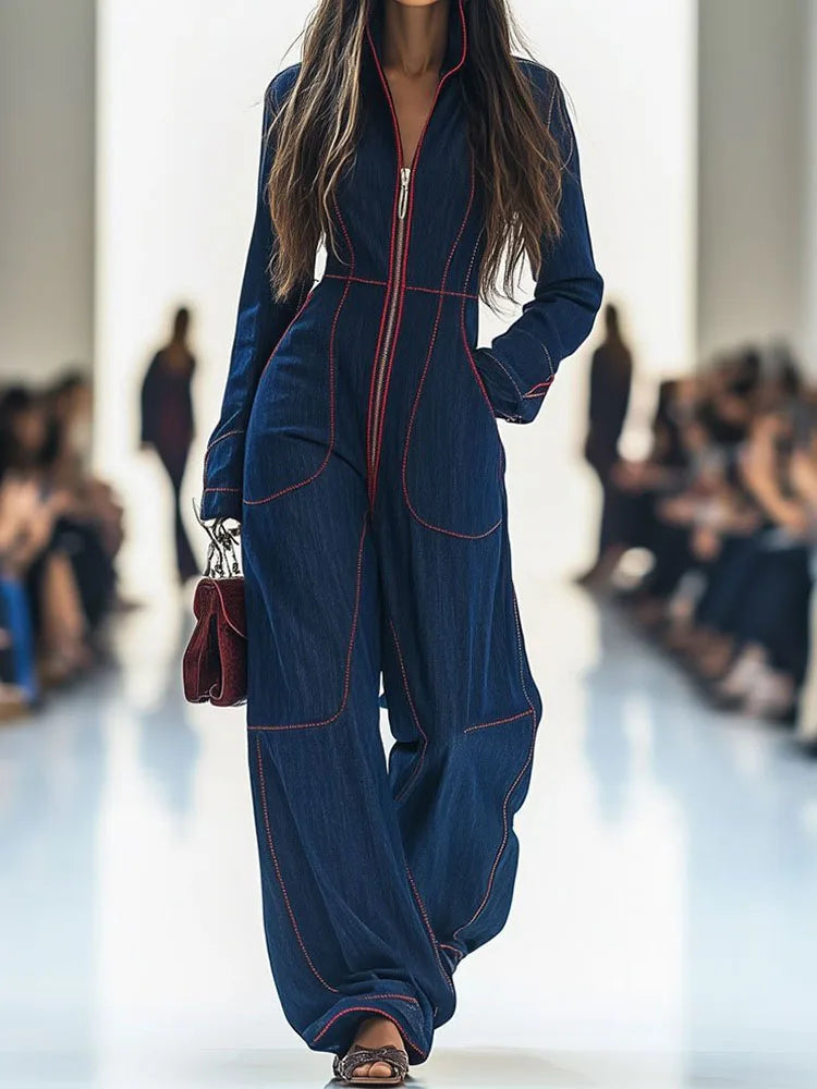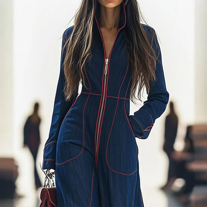 Elegant Deep V-neck Zipper Long Jumpsuits Women Casual Pocket Street Cowboy Romper Fashion Long Sleeve Waist Overalls Playsuits
