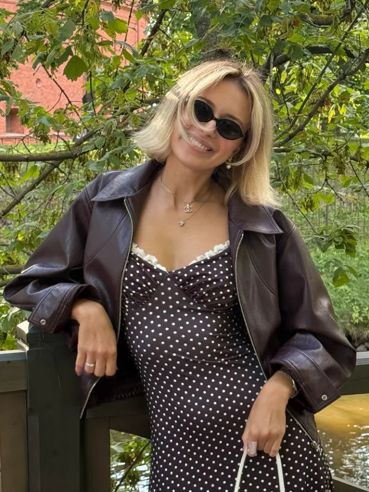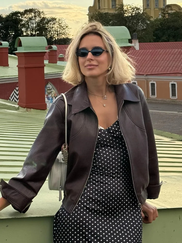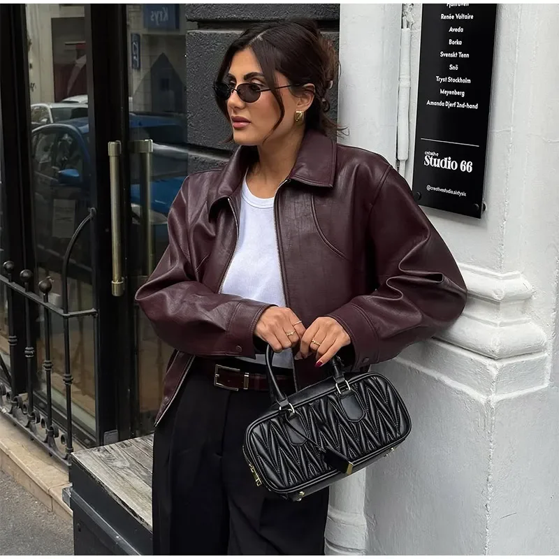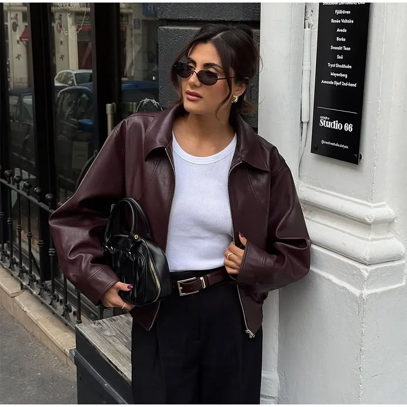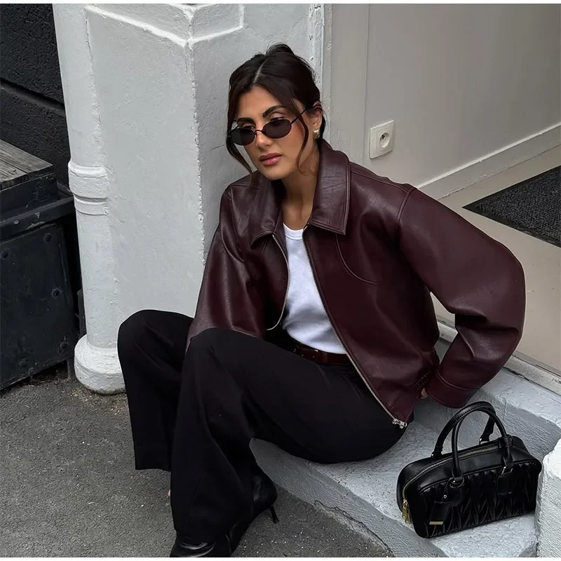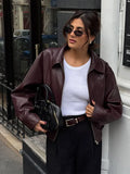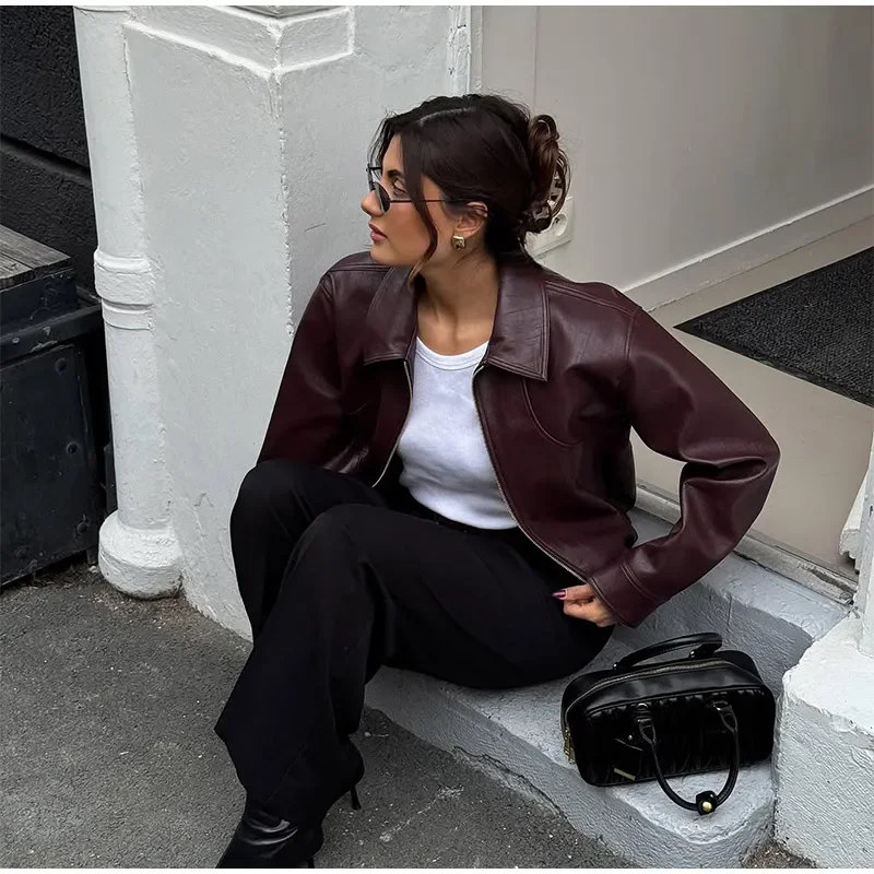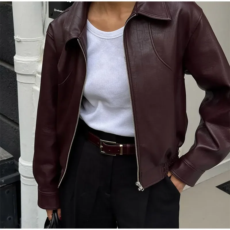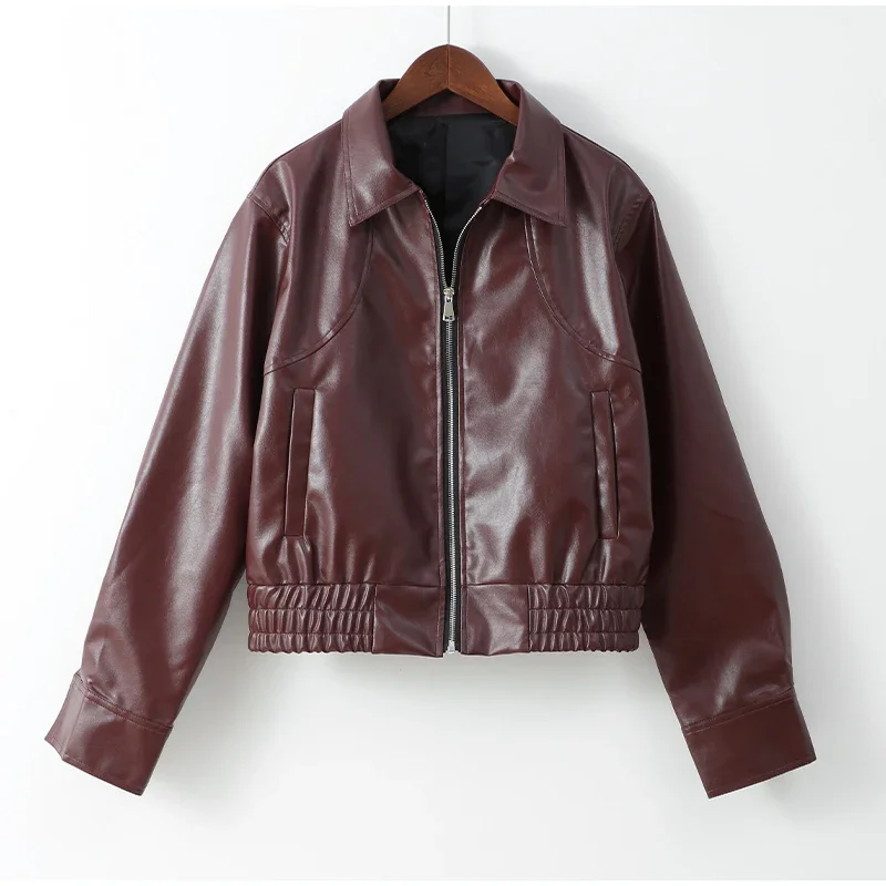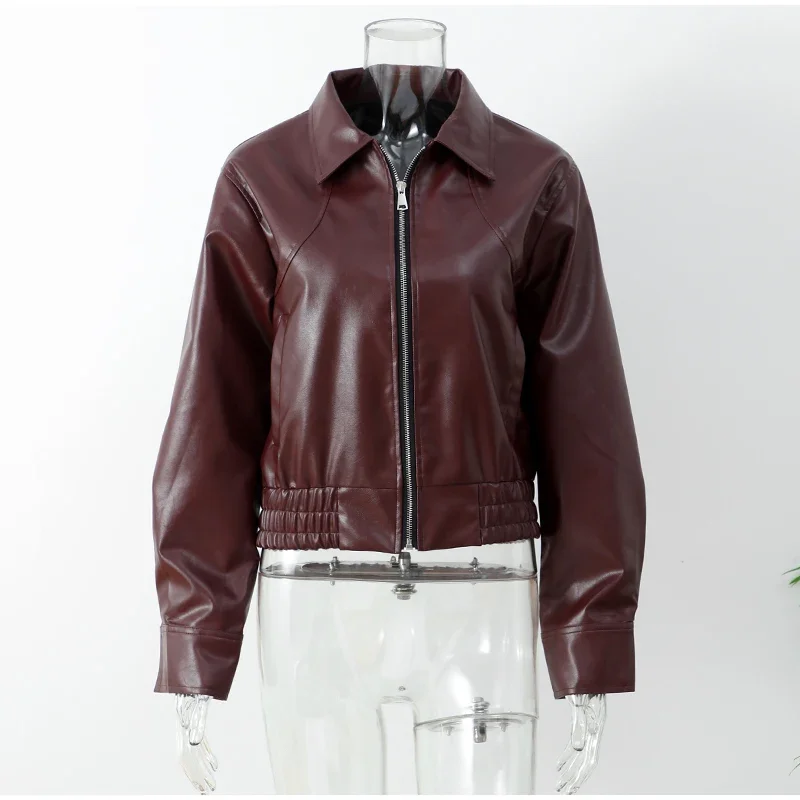 Fashion Lapel Short Leather Coat Women Retro Solid Zipper Simple Long Sleeve Jackets Female Autumn Fashion Casual Street Jacket