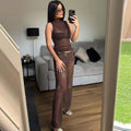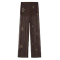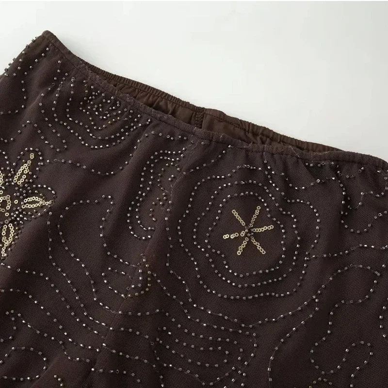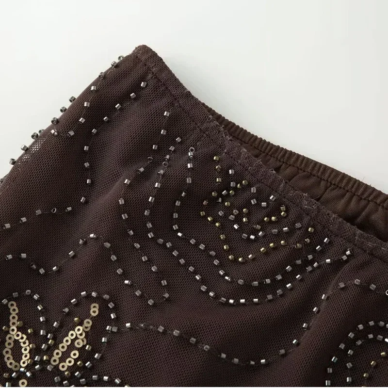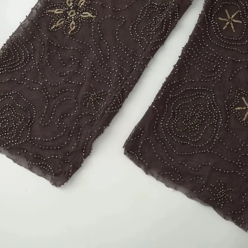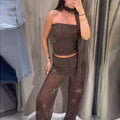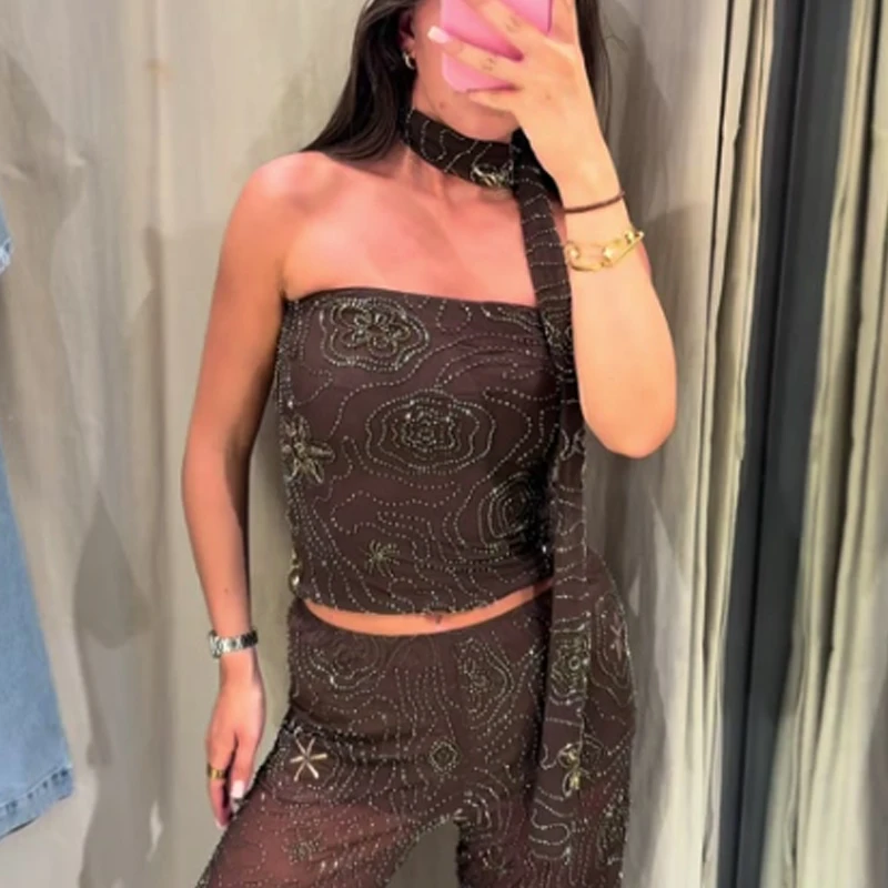 HXAO Tulle Women's Two Pieces Set Baggy Sequin Pants Sets Strapless Crop Top Beaded Long Pants 2 Piece Sets Semi Sheer Trousers