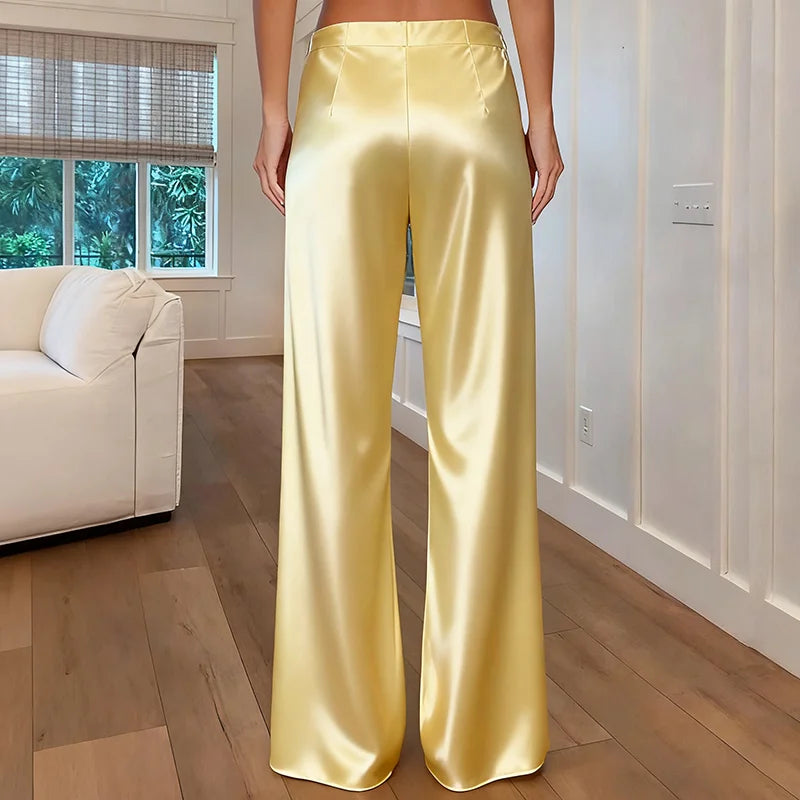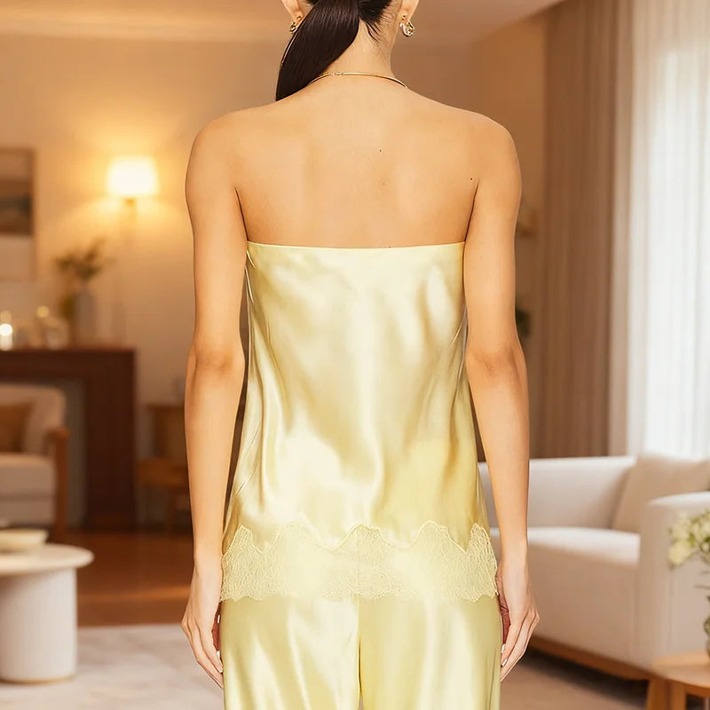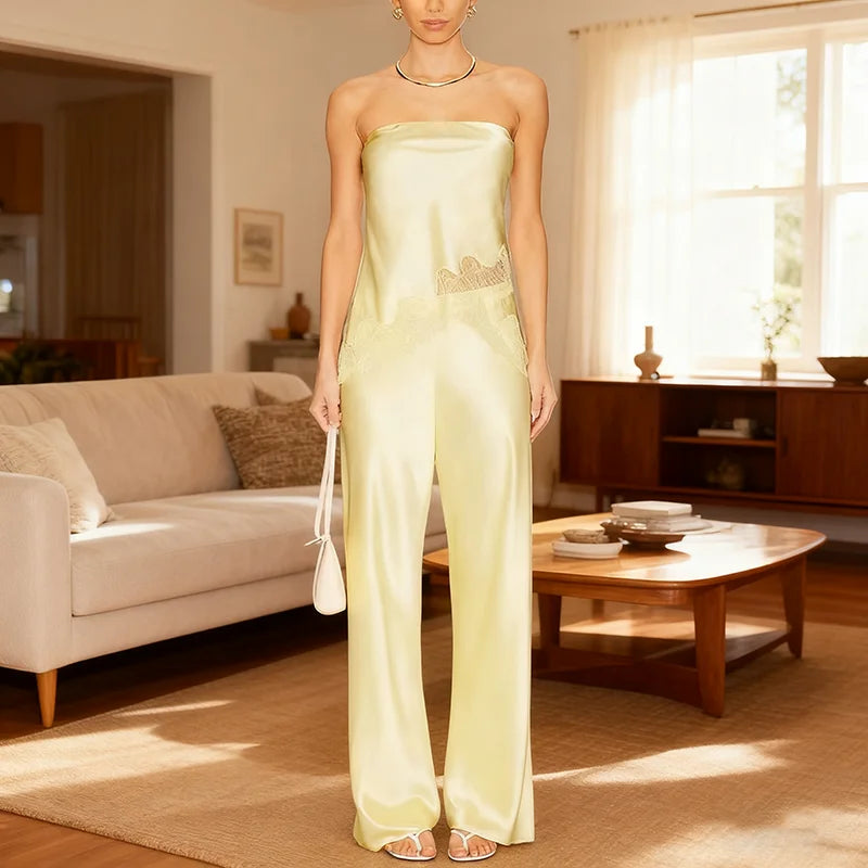 New Hollow Strapless Tube Tops & Pant Woman 2 Piece Set Outfit Summer Embroidered Lace Satin Suits Sexy Backless Female Clothing