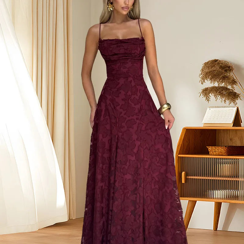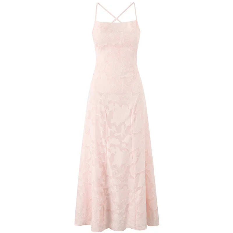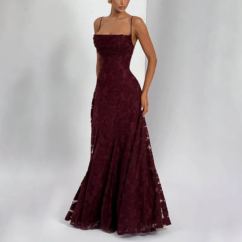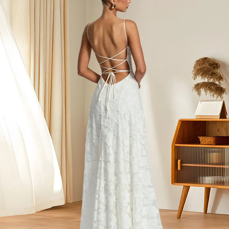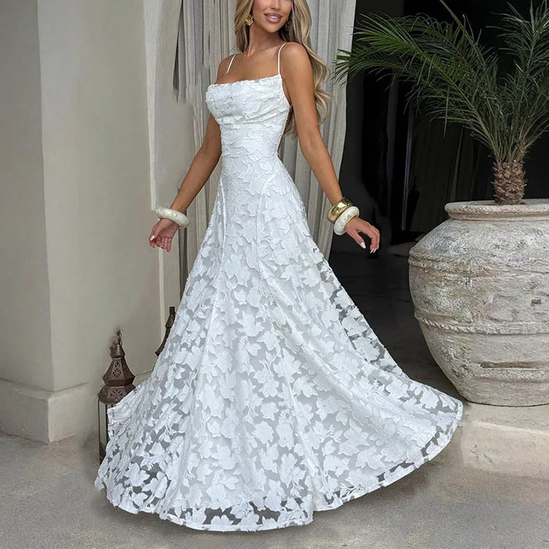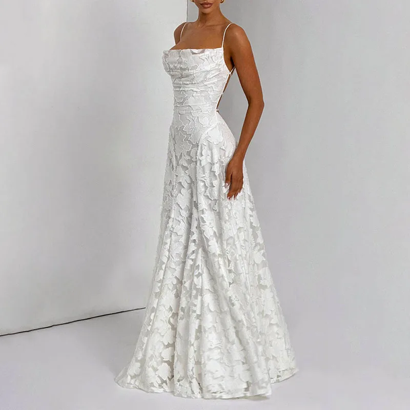 New Sexy Sleeveless Backless Boho Dress Elegant Jacquard Crochet Lace Prom Dresses Summer Solid Slash Neck Embroidery Long Dress