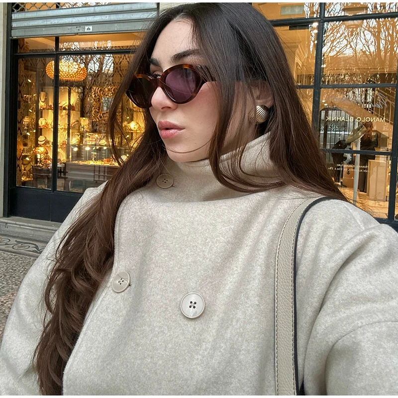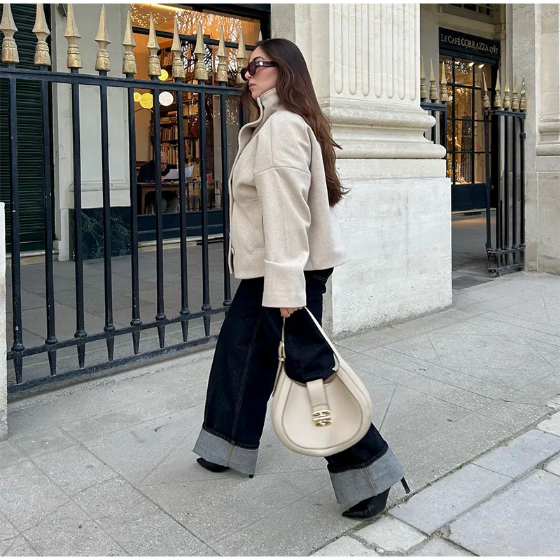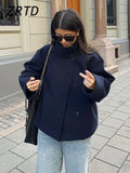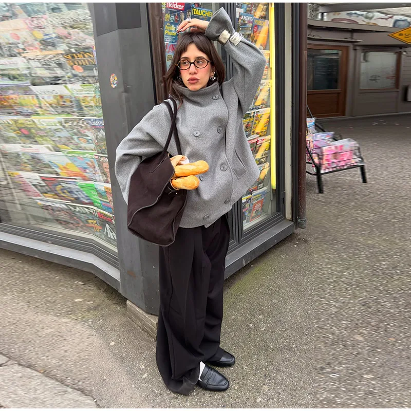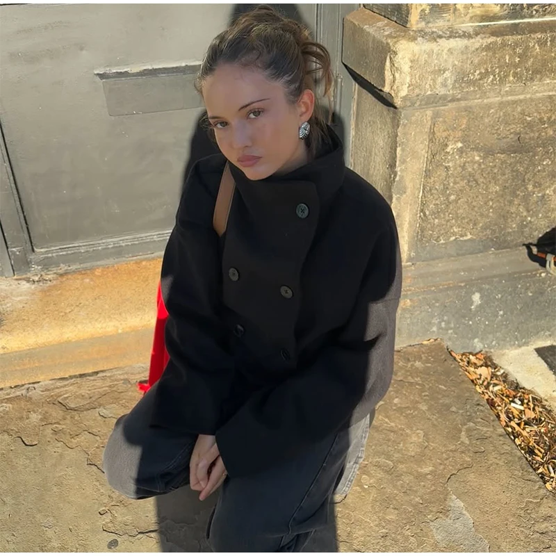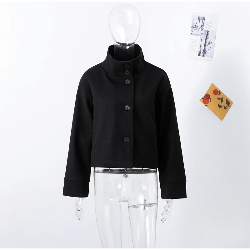 Street Women's Short Woolen Coat Stand Collar Single Breasted Long Sleeve Pockets Jacket 2025 Autumn Lady Casual Commute Outwear