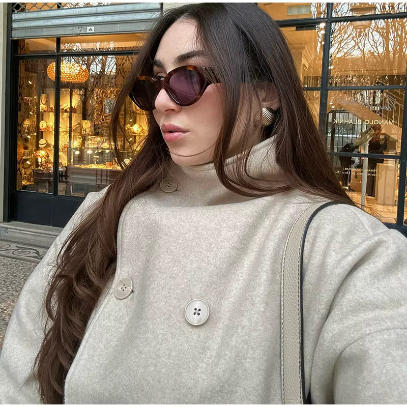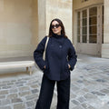 Stand collar and single-breasted buttons that frame the face and give a clean, modern silhouette.