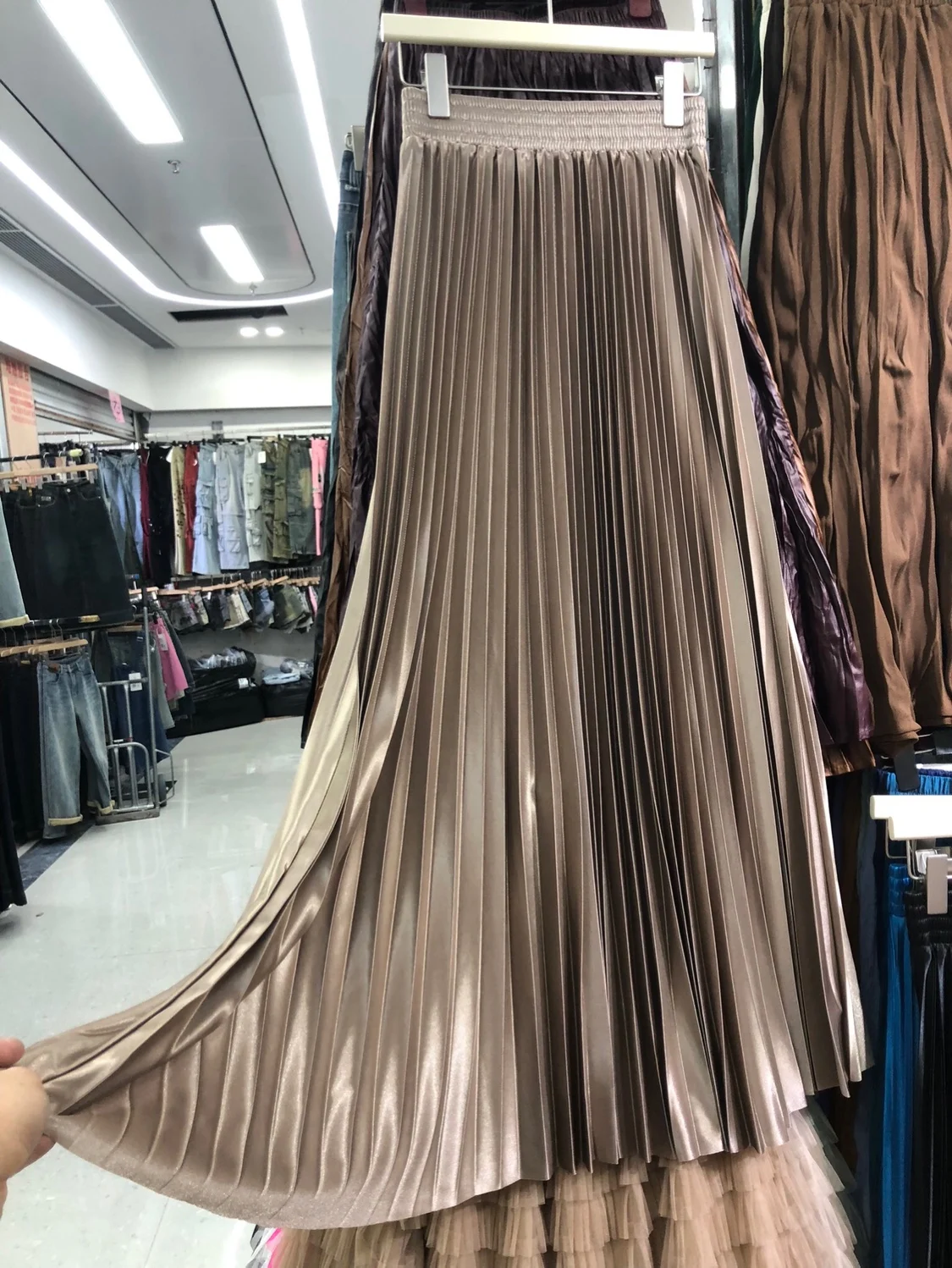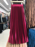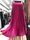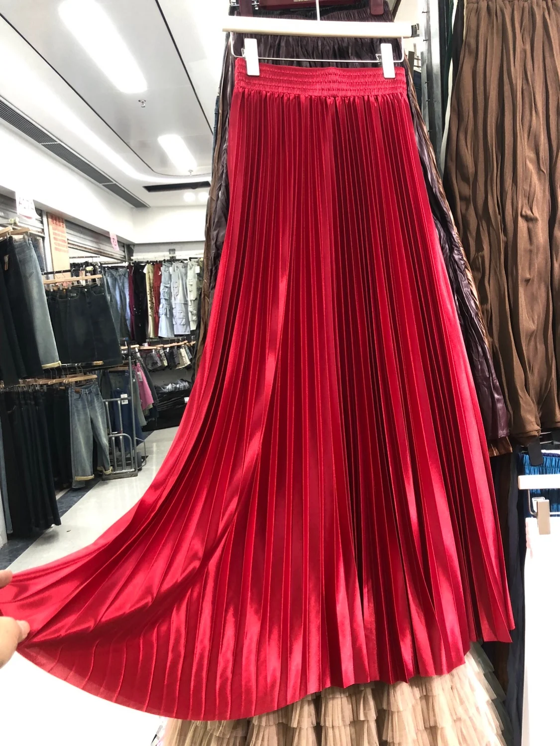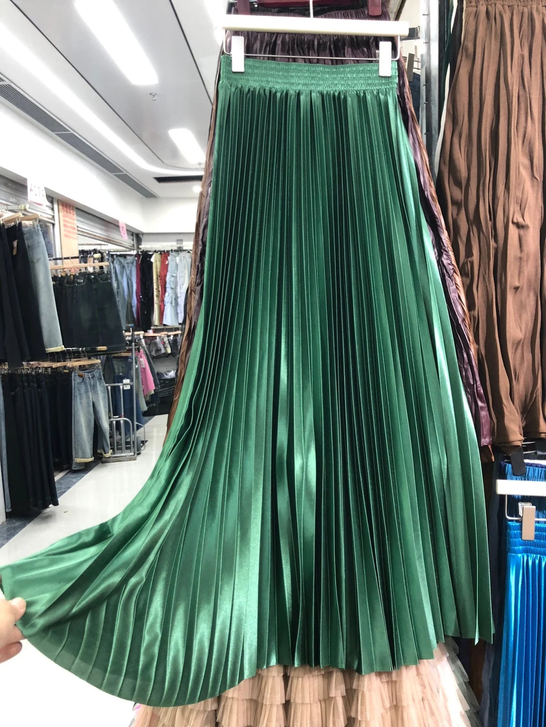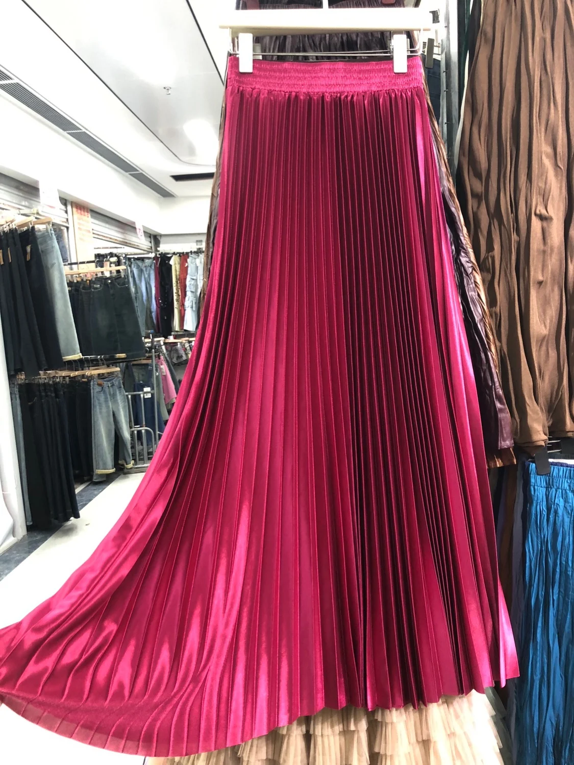 TingYiLi Women's 100cm Long Maxi Pleated Skirt Spring Summer Vintage High Waist Shiny Gold Silver Blue Green Red Straight Skirts