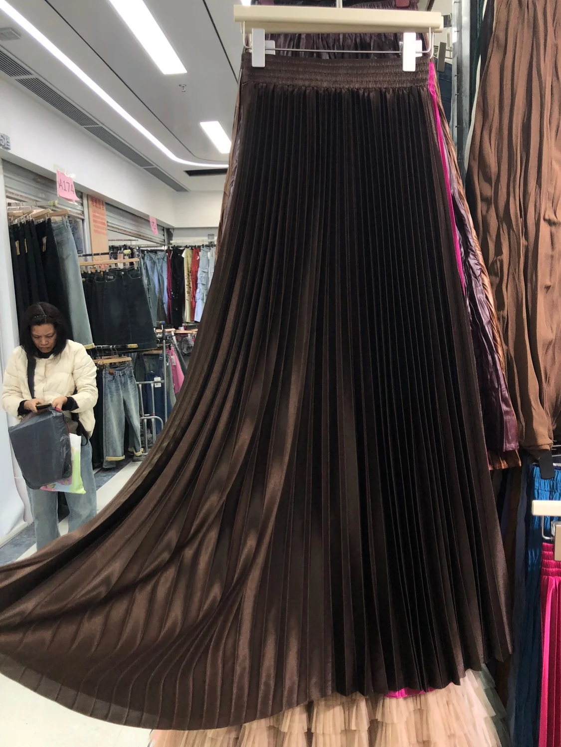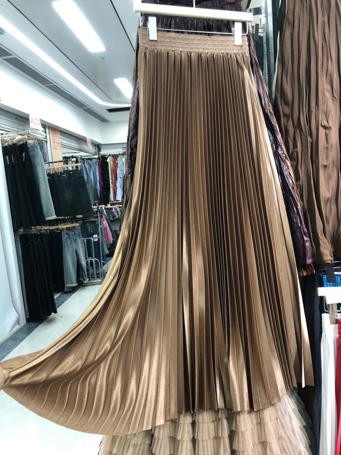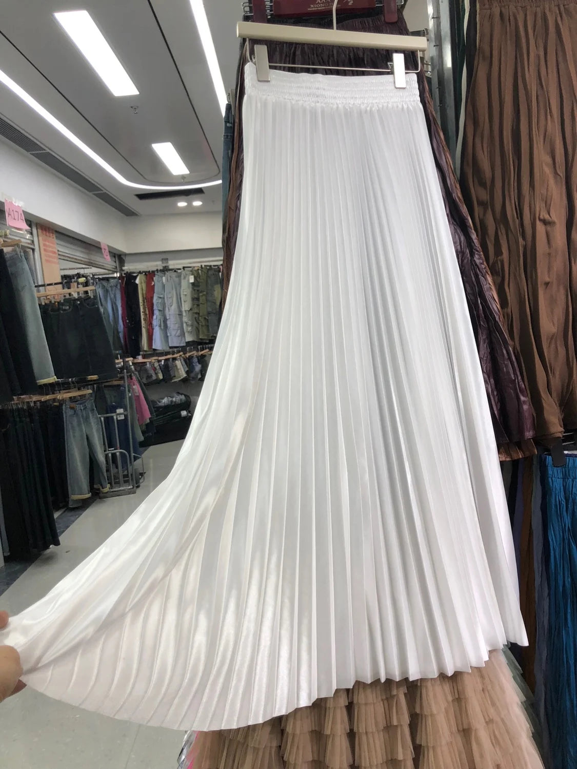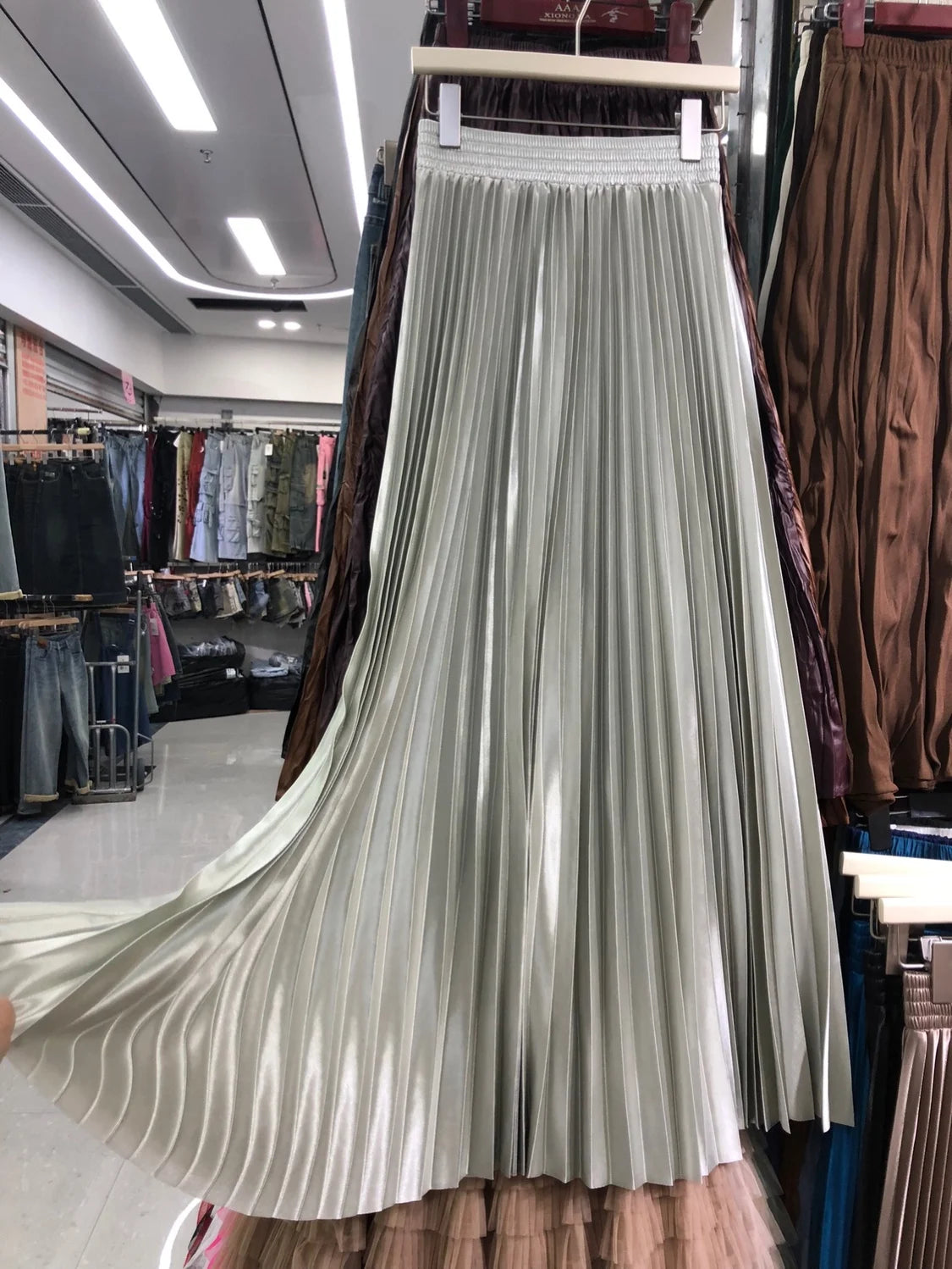TingYiLi Women's 100cm Long Maxi Pleated Skirt Spring Summer Vintage High Waist Shiny Gold Silver Blue Green Red Straight Skirts