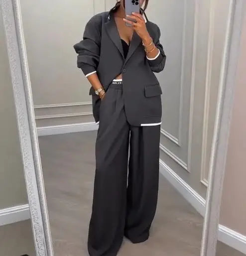Two Piece Set Women Outfit 2025 Spring Autumn New Grey Commuting Notched Collar Long Sleeve Blazer & High Waist Pants Set