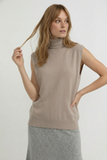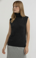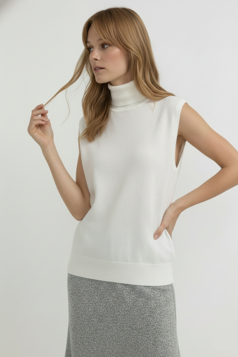 Sleeveless design and sculpted turtleneck create a refined, elongated silhouette that layers beautifully over shirts, blouses, or dresses.