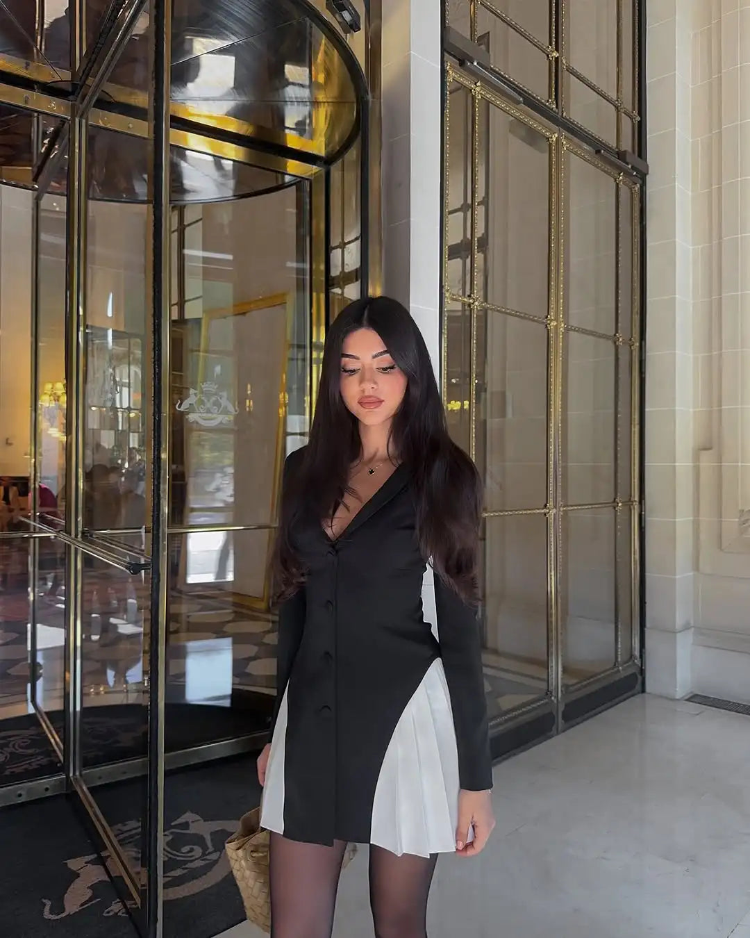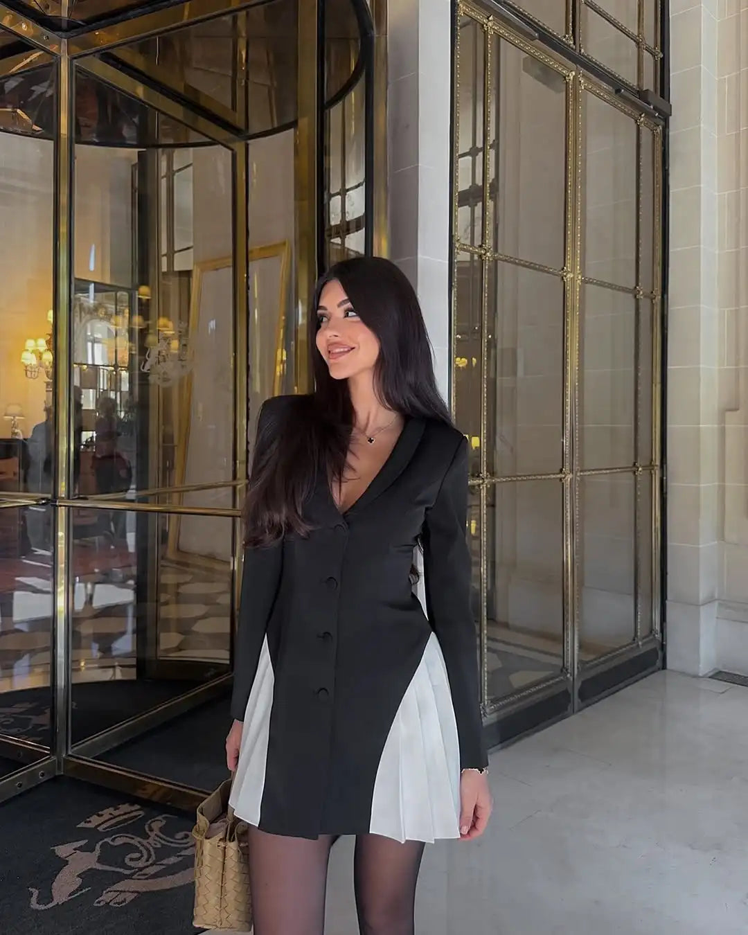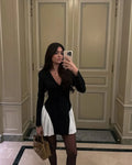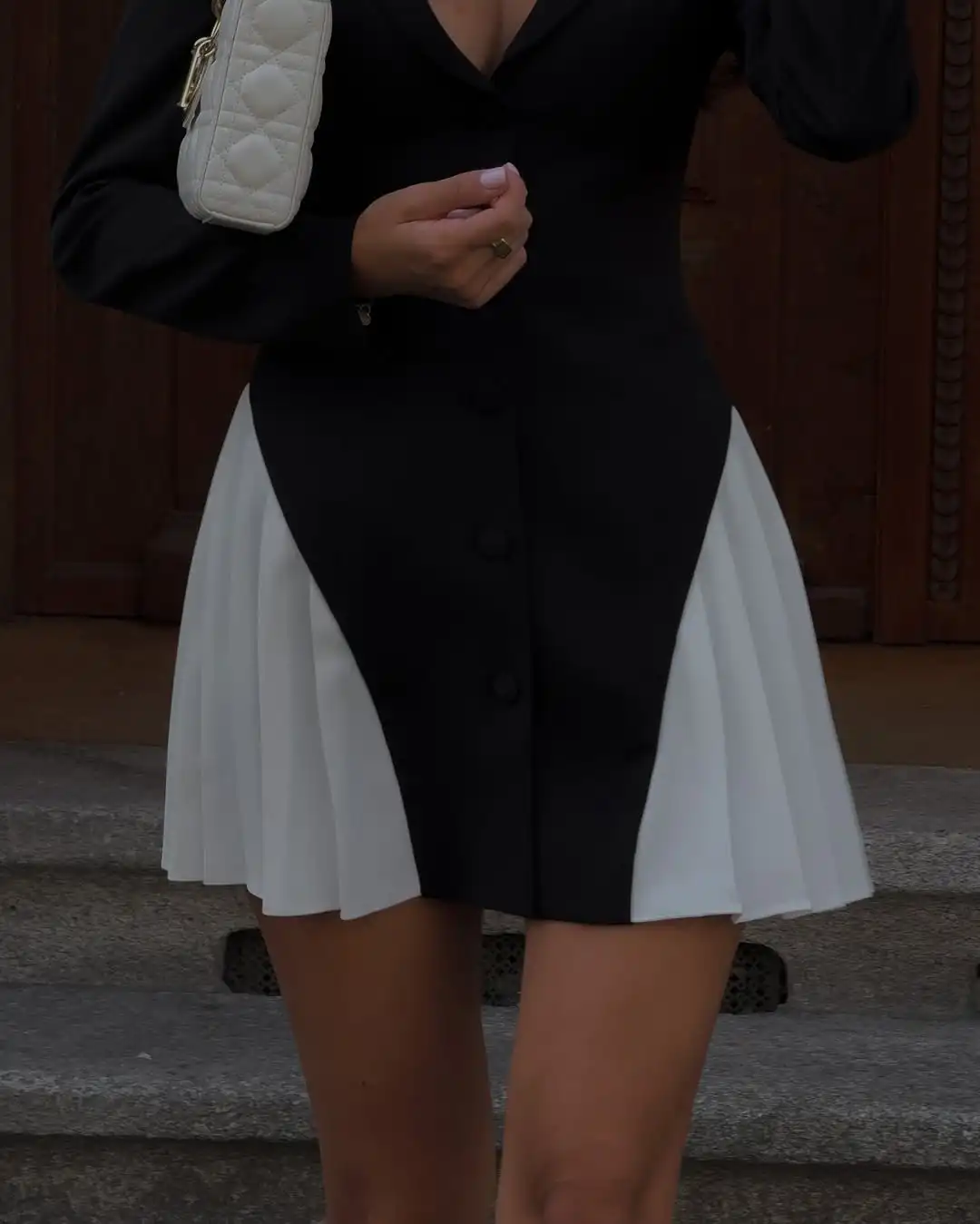 Women Patchwork A-line Pleated Mini Dress Fashion Lapel Single Breasted Full Sleeve Short Dresses Casual Ladies Party New Gowns