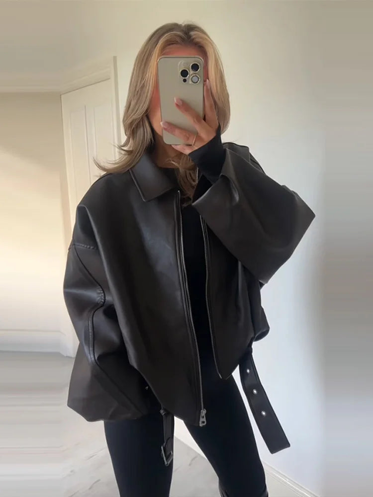 Women's Jacket Lace Up Leather Turn-Down Collar Zipper Dropped Shoulder Waist Belt Female Coat Oversized Casual Coats For Ladies