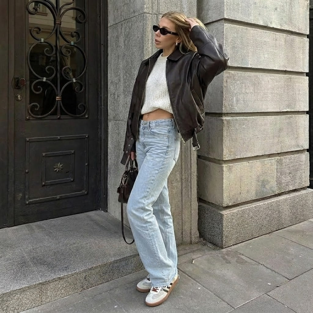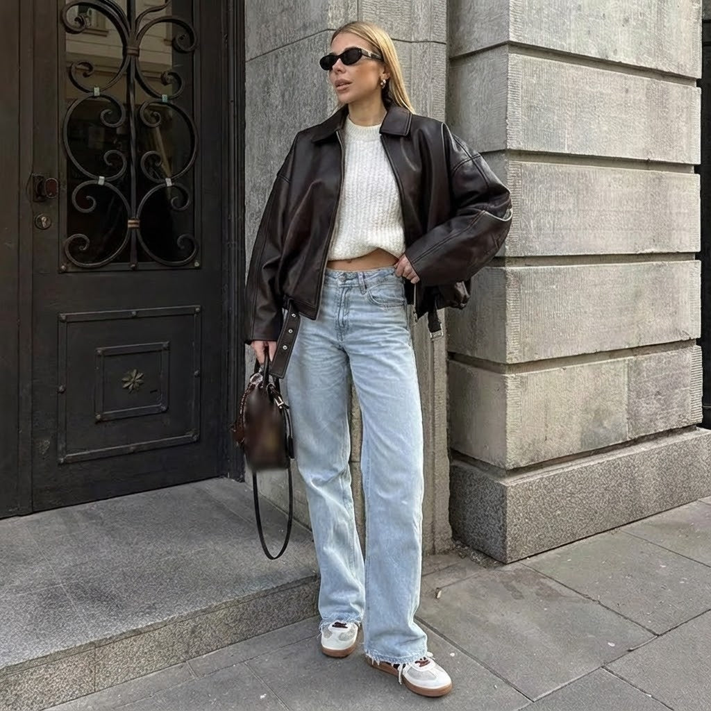 An oversized faux‑leather jacket that defines your waist and adds instant high‑street attitude