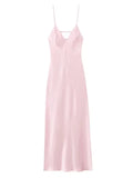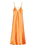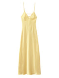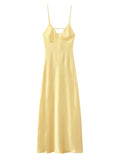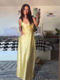 Women's Yellow Elegant Stain Backless Gown Spaghetti Strap V-neck Pleated Dress High Waist Summer Beach Party Robe Chic Vacation